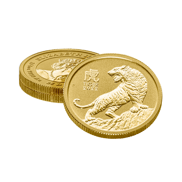 The 1/4 troy ounce gold Lunar 2022 coin is dedicated to the Tiger. This is the third release of the Lunar III Series from the Perth Mint. This gold coin is minted in 1/4 troy ounce 99.99% pure gold, representing the Lunar coin of 2022, the Year of the Tiger.