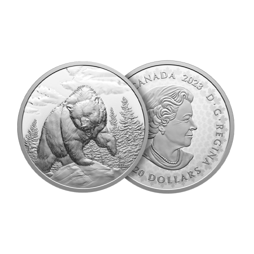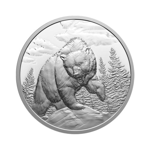 Diese 1 Troy-Ounce Silbergrizzly-Münze ist in Proof-Qualität mit ultra hohem Relief. Die Münze wurde 2023 von der Royal Canadian Mint geprägt und enthält 31,103 Gramm 99,99% reines Silber. Die weltweite Auflage ist auf 6.000 Stück begrenzt und die Münze wird in einer Präsentationsbox geliefert.