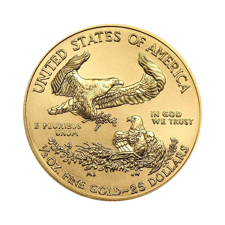 This gold American Eagle coin from the USA contains exactly 1/2 troy ounce of pure gold and has been issued since 1986 as the investment coin of America. We provide gold coins from various previous years.