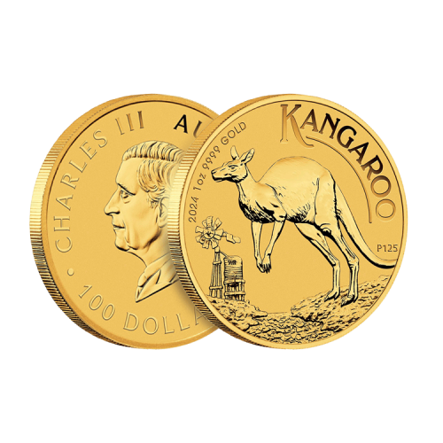 Deze gouden Australian Kangaroo munt is in 2024 geslagen door The Perth Mint. De munt bevat 31,103 gram 99,99% puur goud en toont een nieuw ontwerp van een kangoeroe.