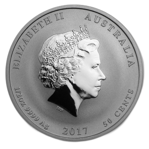 Halve troy ounce zilveren Lunar munt 2017 - Het jaar van de haan. Deze munt heeft een gewicht van 15,55 gram en is vervaardigd uit puur zilver. Op de voorkant staat een afbeelding van een haan.