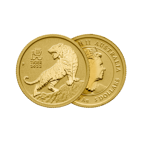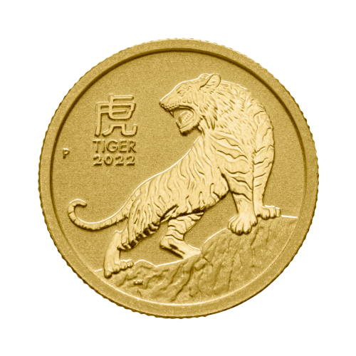 1/20 Troy ounce gouden munt Lunar 2022. Dit is de gouden Lunar munt van het jaar van de Tijger, uitgegeven door de Perth Mint uit Australië.