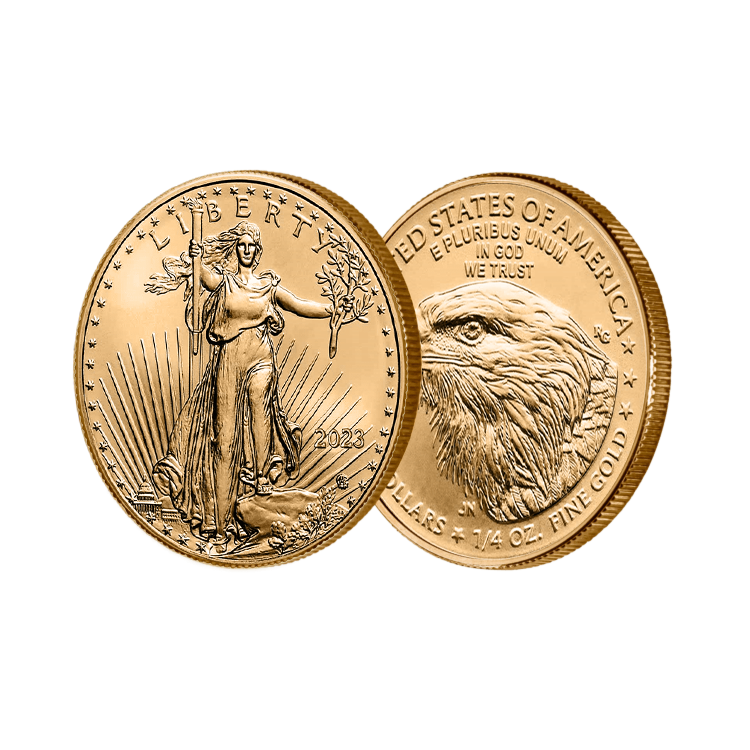 Deze 1/4 troy ounce gouden American Eagle munten worden geproduceerd door de U.S. Mint en vormen de officiële beleggingsmunt van de Verenigde Staten. De munt is vervaardigd uit 22-karaats goud (of 91,67% puur), met een goudgewicht van 1/4 troy ounce (7,77 gram).