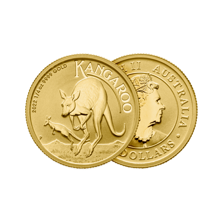 De gouden Kangaroo munt van 2022 is vervaardigd door de Perth Mint in Australië. Deze 1/4 troy ounce puur gouden (99,99%) munten hebben een uniek dier als ontwerp: de kangoeroe.