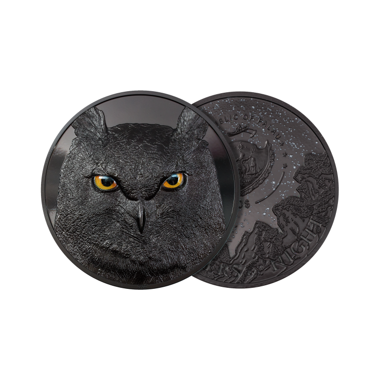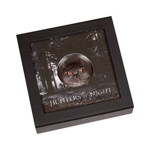 Deze 2 troy ounce zilveren munt is de nieuwste uitgave in de serie 'Hunters By Night' en is gewijd aan de Oehoe. De munt is voorzien van Smartminting-technologie en heeft een Obsidian Black Proof kwaliteit, gecombineerd met een zijden afwerking.